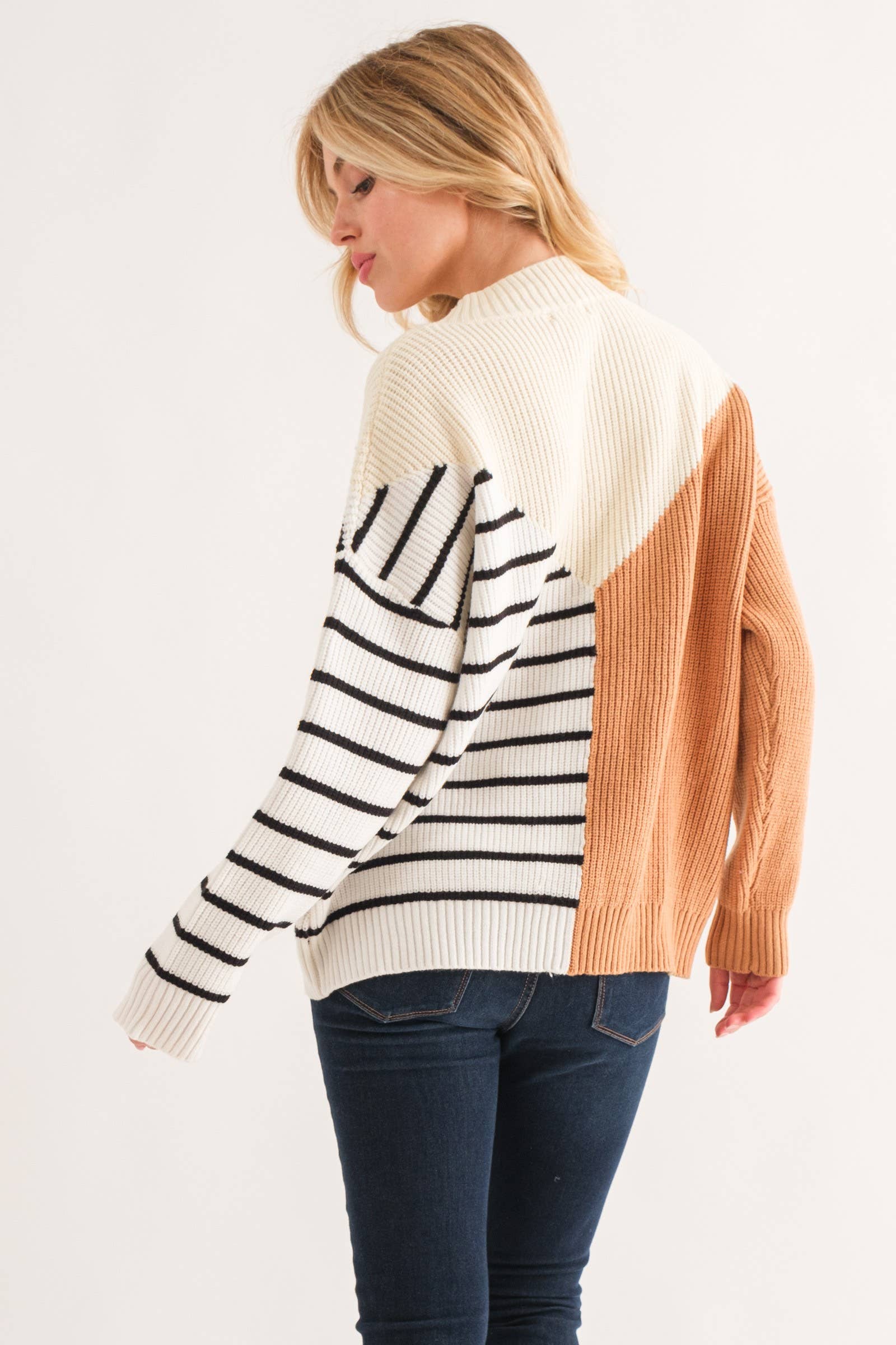 This cozy crewneck combines stripes and color blocking for a sweater that's both playful and chic.