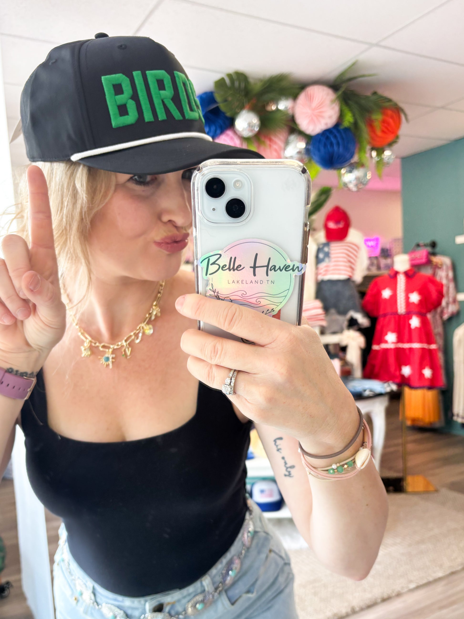 Cheer on the Birds with our "Birds" performance rope hat. One of our best sellers now available for Philly fans! Thick kelly green embroidery on a black hat with white rope.