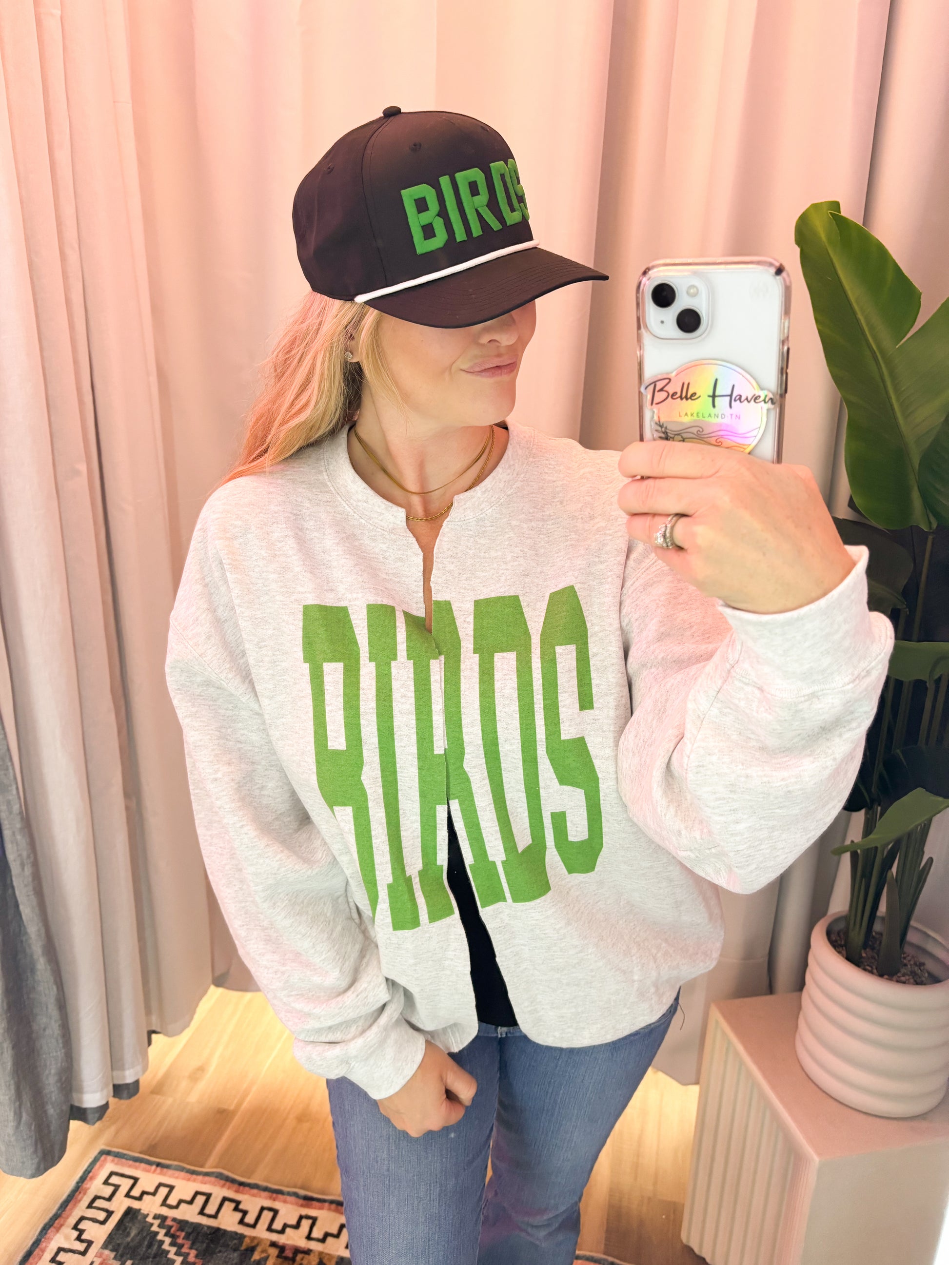 Color: Heather Gray with Kelly Green “BIRDS” graphic