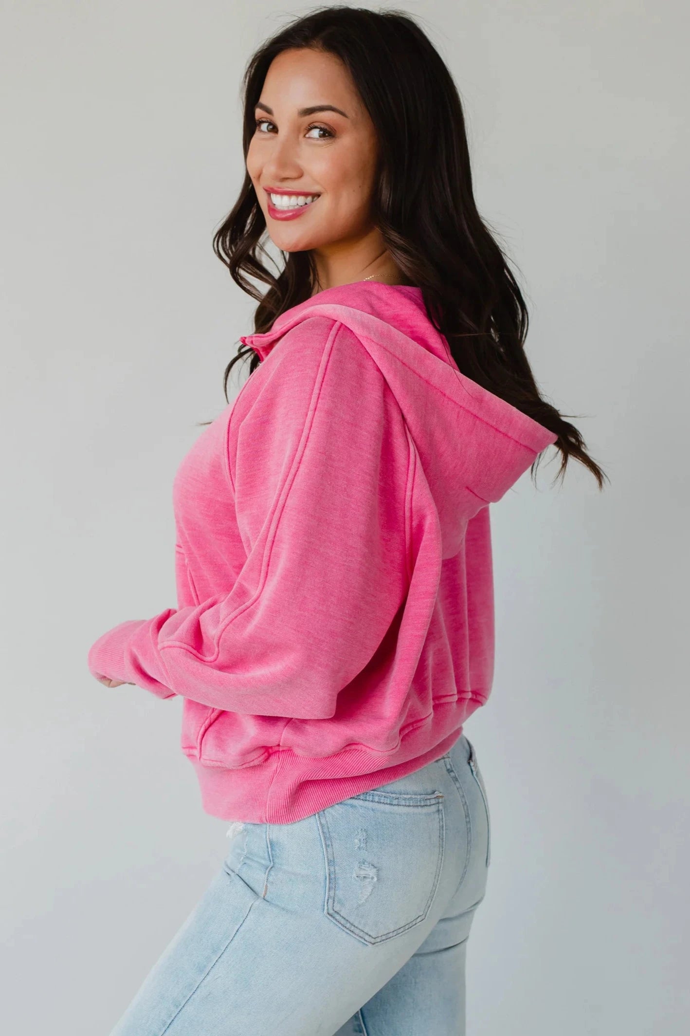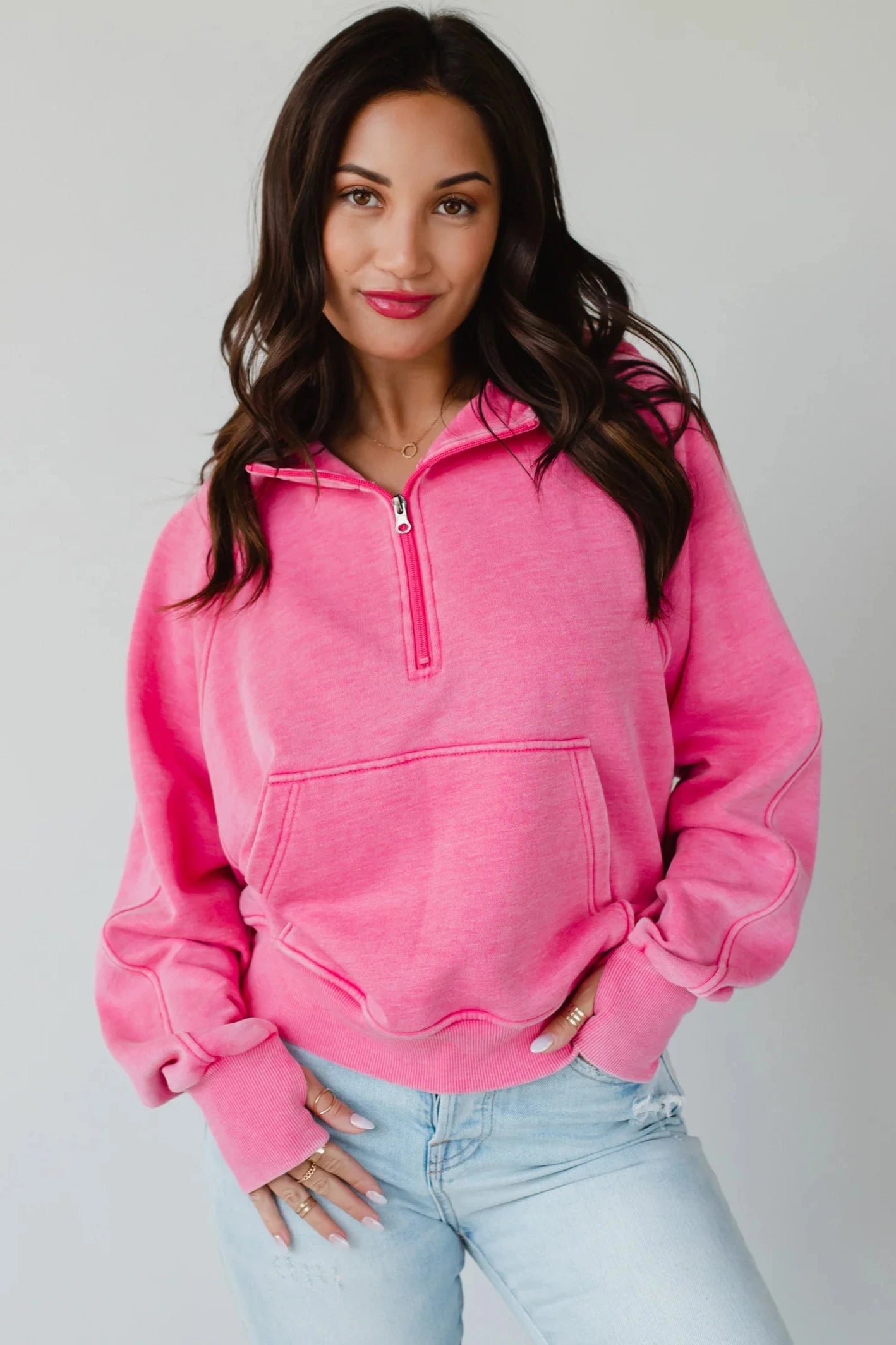 This bright pink half-zip sweatshirt is a must-have for cozy, casual style! Made from a soft, comfortable fabric, it features a relaxed fit with dropped shoulders and ribbed cuffs for a laid-back look. The half-zip neckline adds a bit of versatility, letting you wear it zipped up for extra warmth or open for a more relaxed vibe. With a front kangaroo pocket, it’s perfect for keeping your hands warm or storing small essentials. Pair it with jeans or leggings for an effortlessly chic and cozy outfit, whether you're lounging at home or running errands.