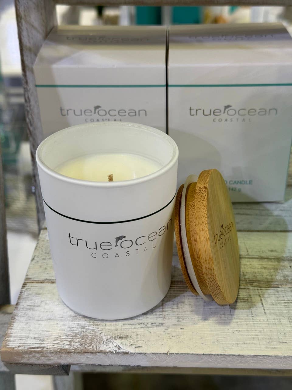 Premium hand poured soy wax candle, featuring True Ocean's signature Coastal, beach, and ocean, fragrance. The energy of the sea contained in an elegantly packaged upscale gift box, this candle comes in a 5 oz glass jar with a wood lid.