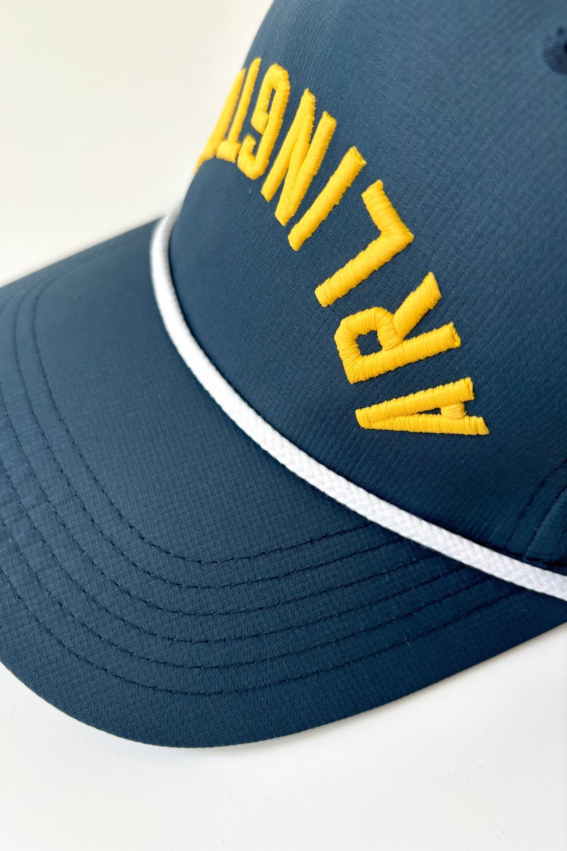 - Available Colors: Navy Blue & Gold or Black Hat with White Lettering (stock photo shows Navy hat)