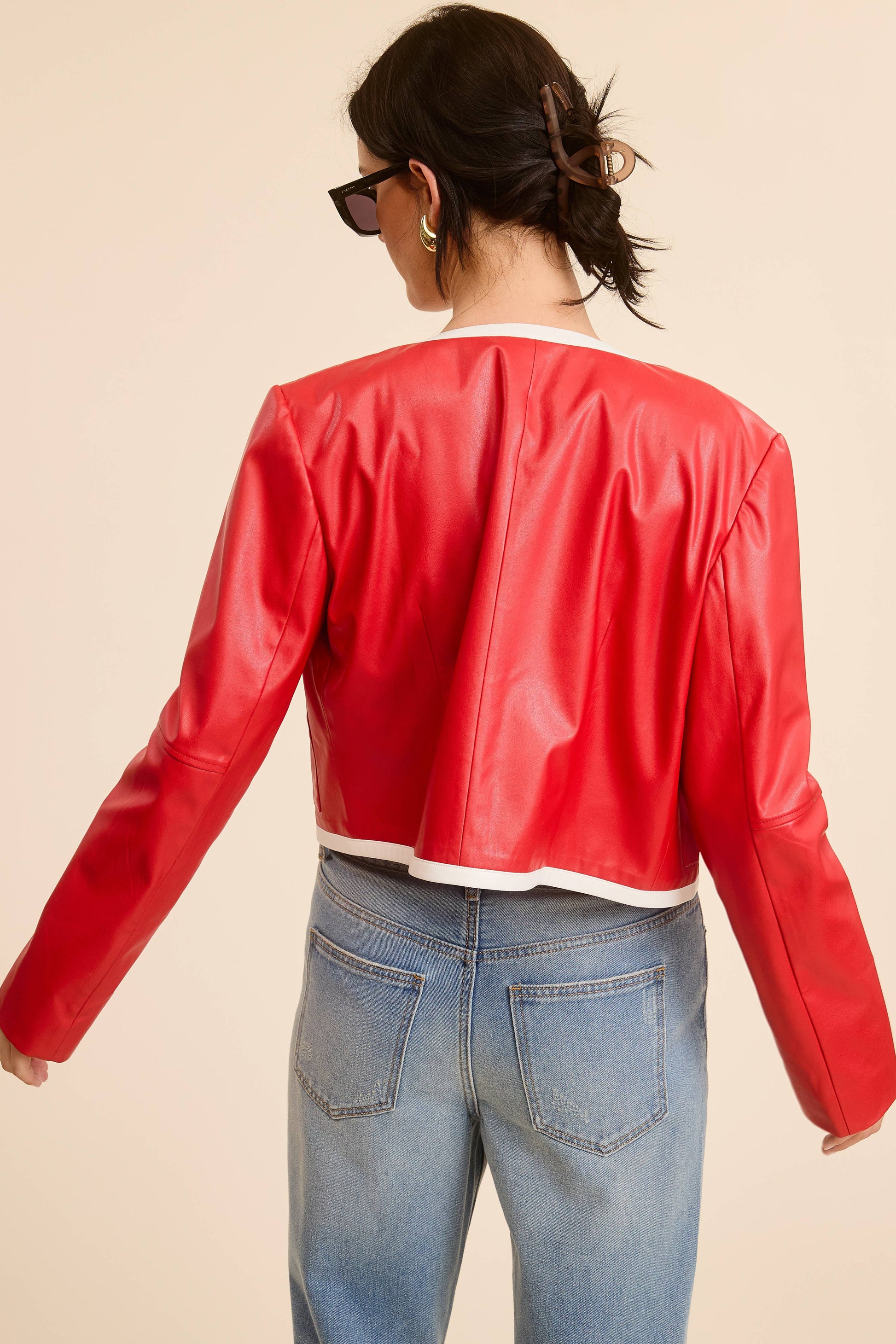 Edgy & Chic faux leather jacket featuring a round neckline, open front, two front pockets, and a striking color block contrast detail lining the neckline, center, and hem.