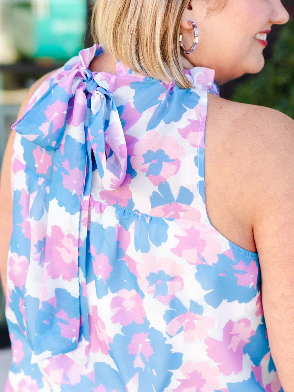 Brighten up your wardrobe with our Primrose Top — a playful blend of charm and color. This sleeveless blouse features a high ruffle neckline and a relaxed silhouette, making it the perfect pick for sunny days and warm getaways. The vibrant floral print in soft pink and sky blue brings a cheerful, feminine vibe, while the lightweight fabric keeps you cool and comfortable. Pair it with white denim for a fresh, effortless look or dress it up with statement earrings and heels for brunch with the girls.