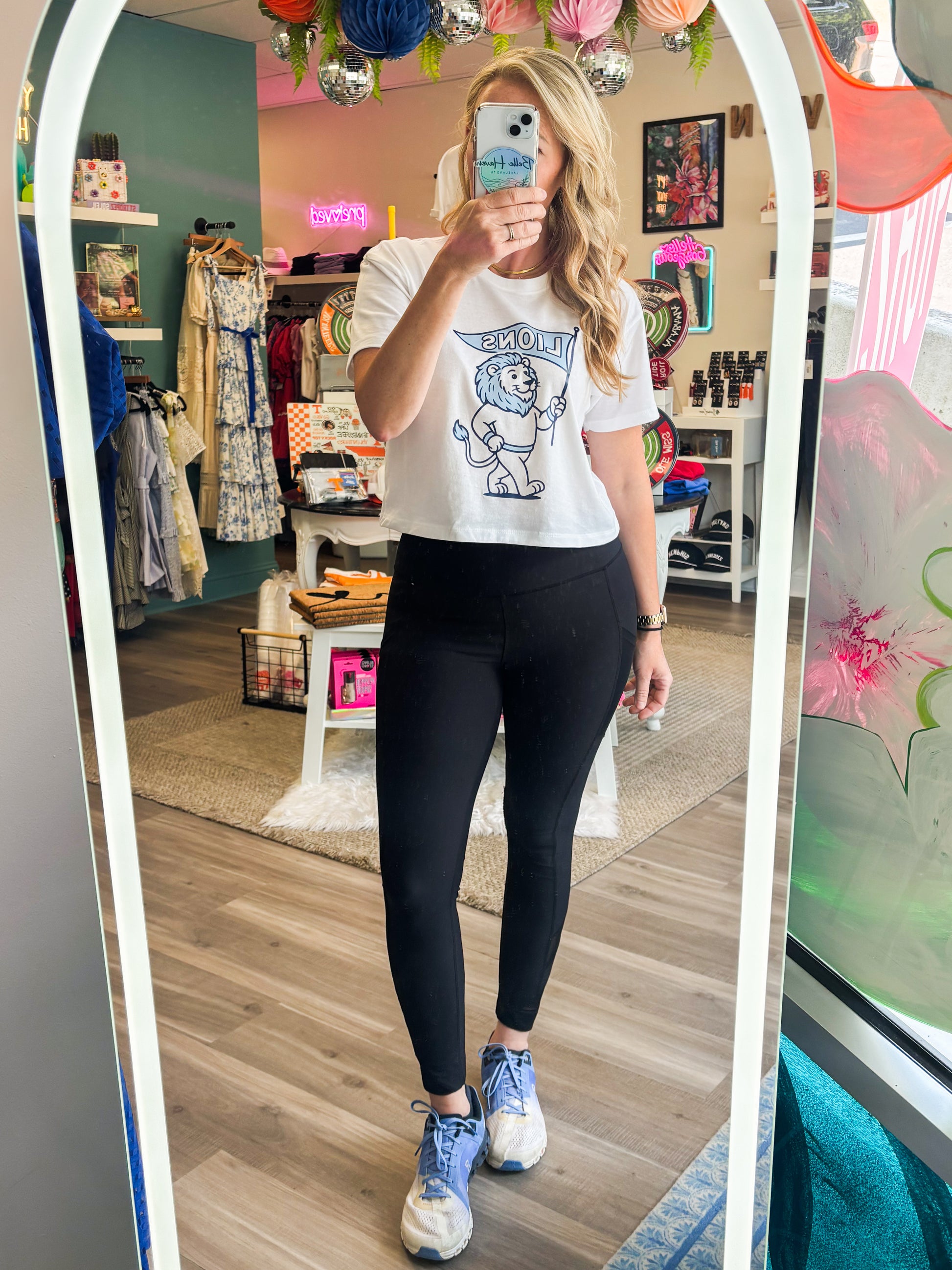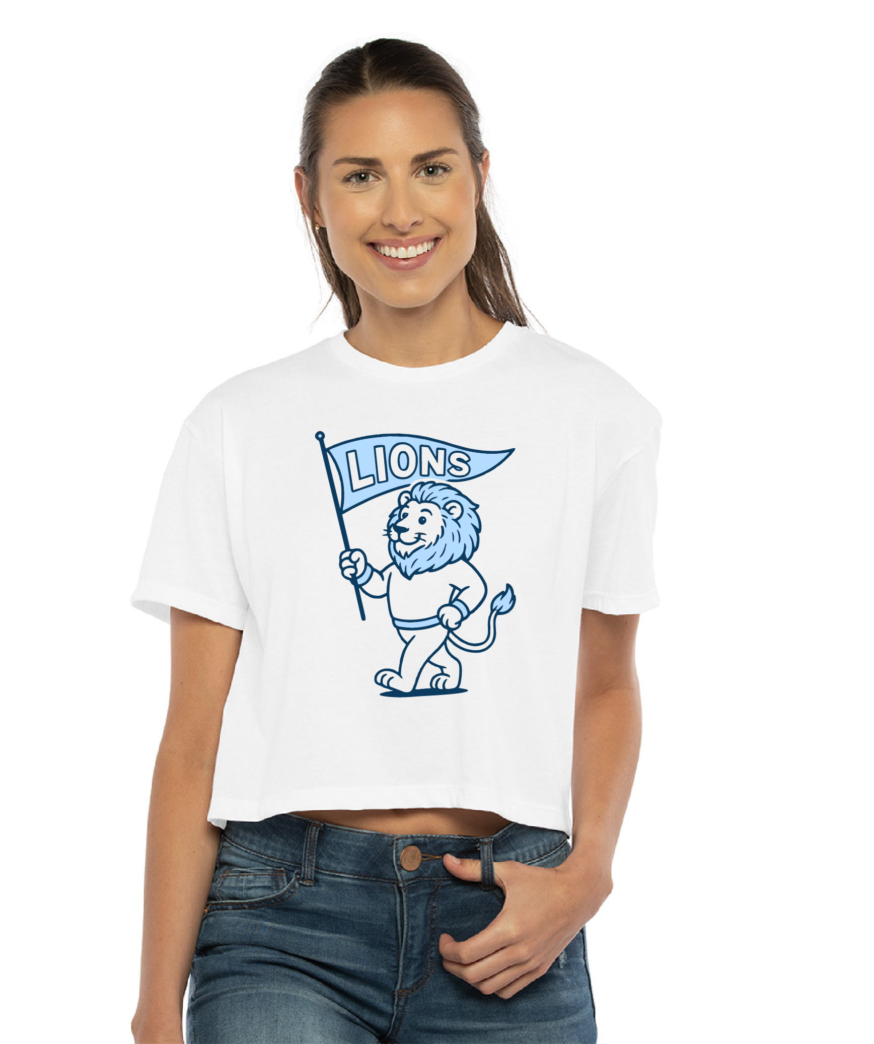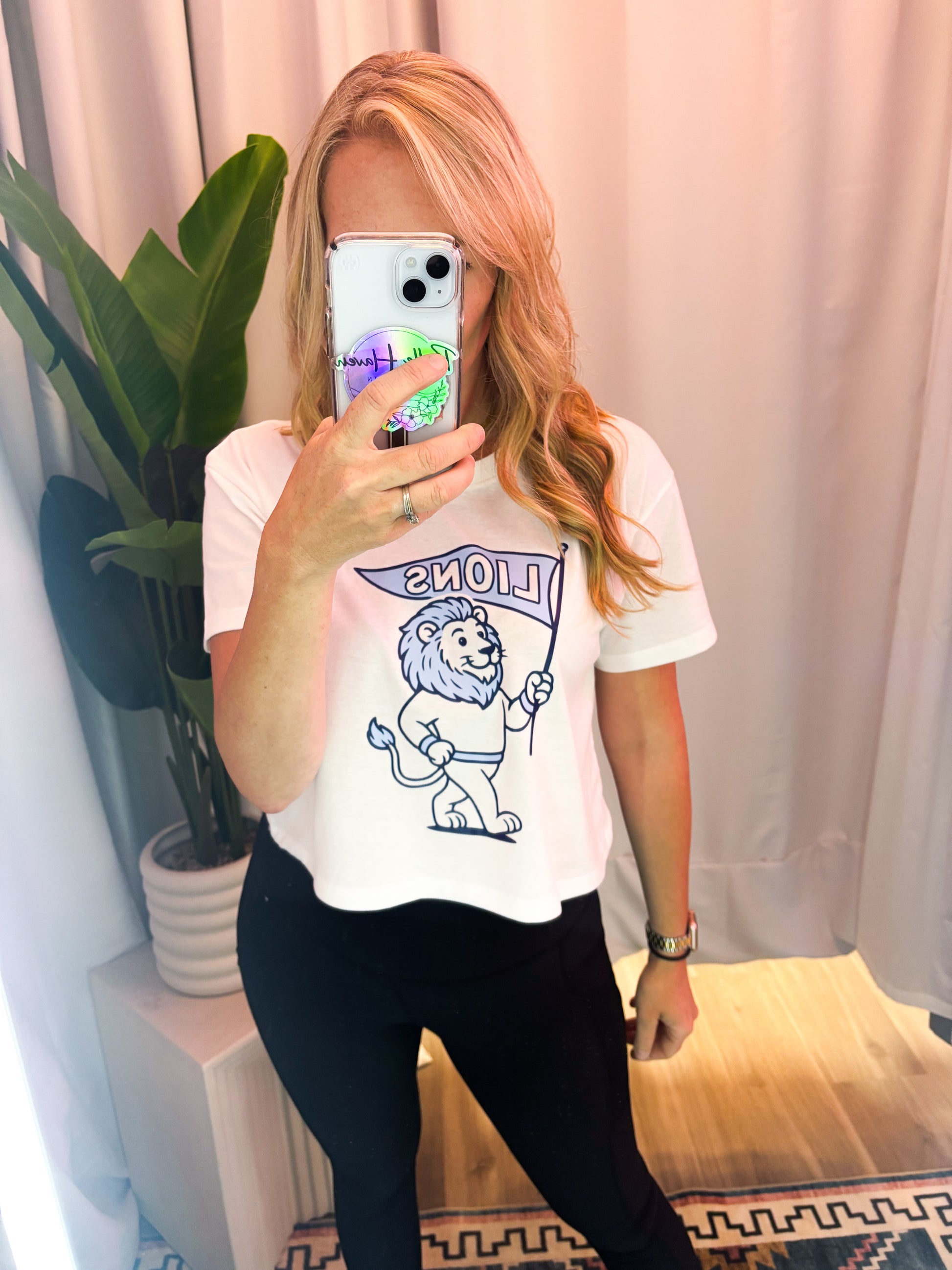 Show up fierce and full of spirit in the Roar & Rally Crop! This playful cropped tee features our proud Lions mascot waving the team flag—perfect for game days, pep rallies, or just repping your pride around town. Made from a soft cotton-poly jersey blend, it’s lightweight, comfy, and just the right amount of sporty-cute.