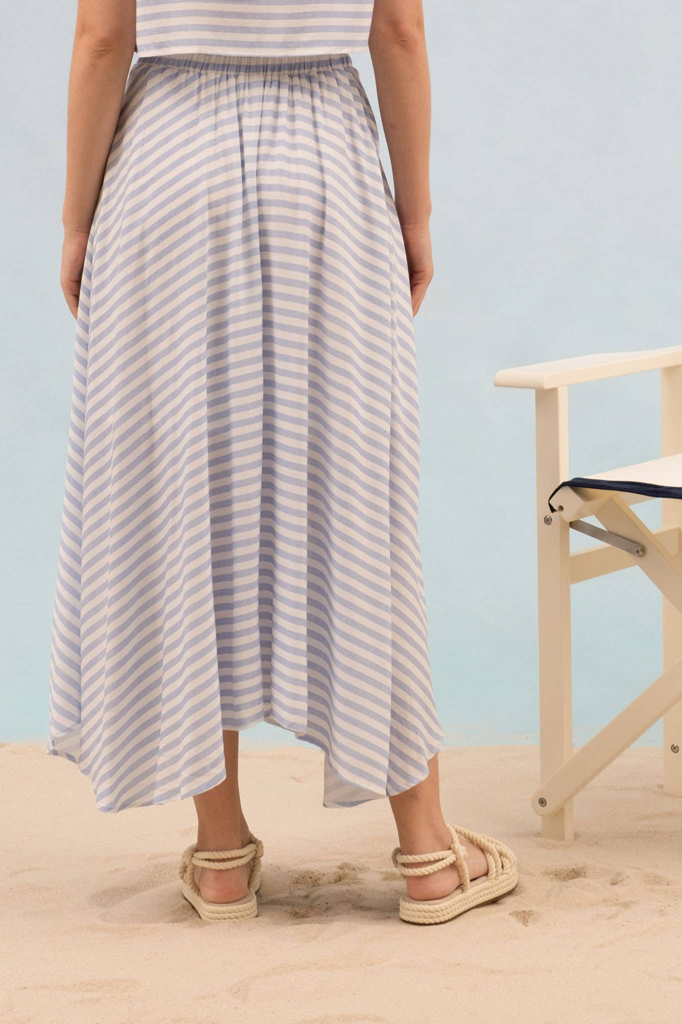 Set sail in style with our Anchors Away Striped Midi Skirt. This coastal-chic skirt features blue and white stripes that are perfect for any coastal millennial trendsetter. With a comfortable fit and midi length, it pairs perfectly with our Harbor tee for a nautical-inspired look.