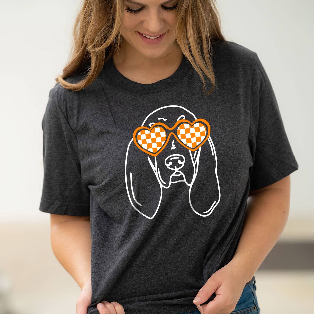 Tailgate in total Tennessee style with the Smokey Shades Tee—your new favorite way to rep the Vols with a wink. This ultra-soft charcoal shirt features a hand-drawn outline of the iconic bluetick hound wearing heart-shaped checkerboard shades, making it a paw-sitively perfect pick for game day (or any day you're feelin' that Rocky Top pride).