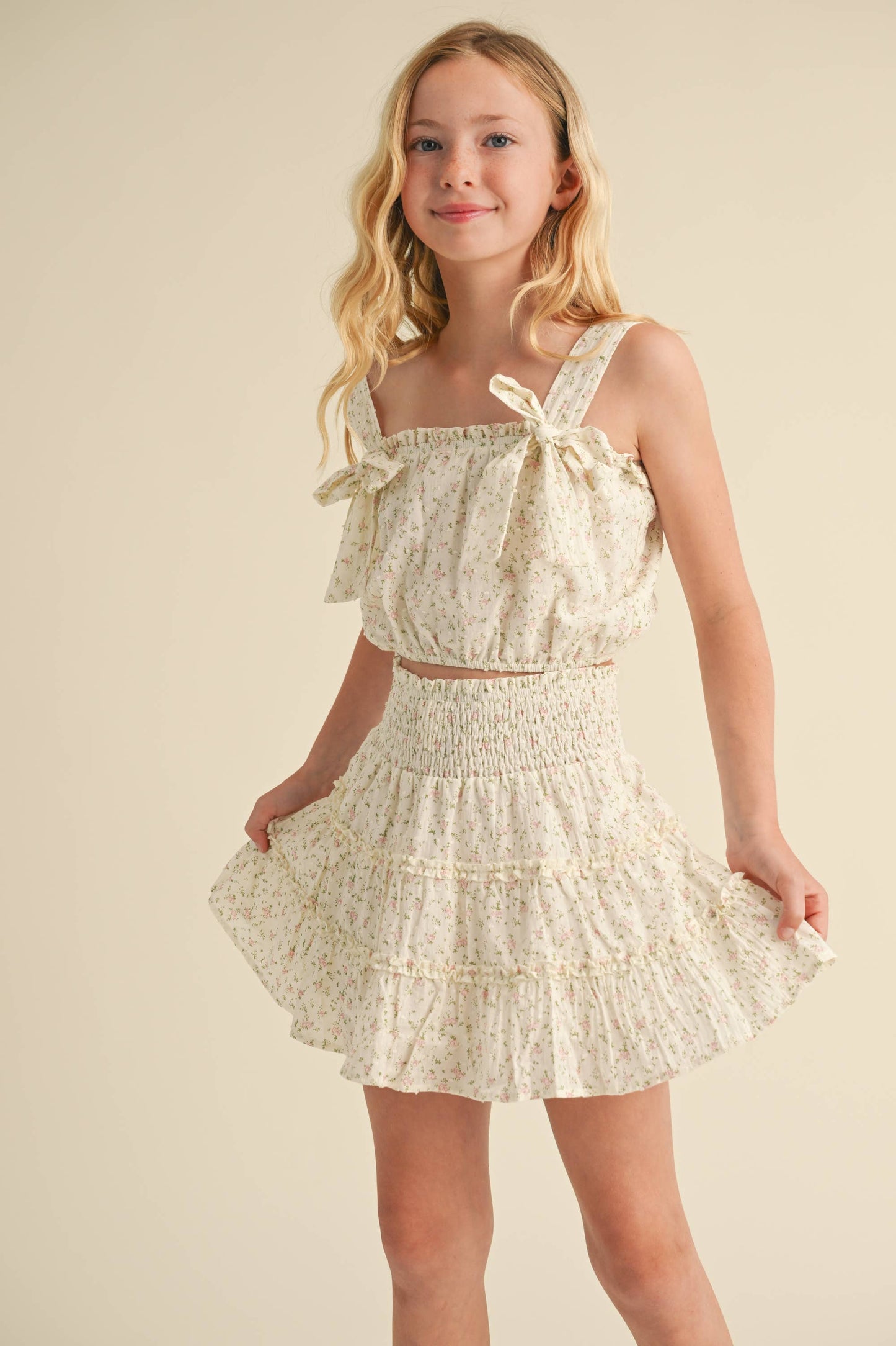 Breezy, blooming, and oh-so-sweet—The Garden Whimsy Set is made for twirling through sunny days. This matching top and skirt duo features a soft floral print on a lightweight cream background. The top includes charming bow-tied straps and a stretchy neckline for all-day comfort, while the tiered skirt boasts a smocked waistband and ruffle details that add just the right amount of movement and playfulness. Perfect for everything from picnics to picture day.