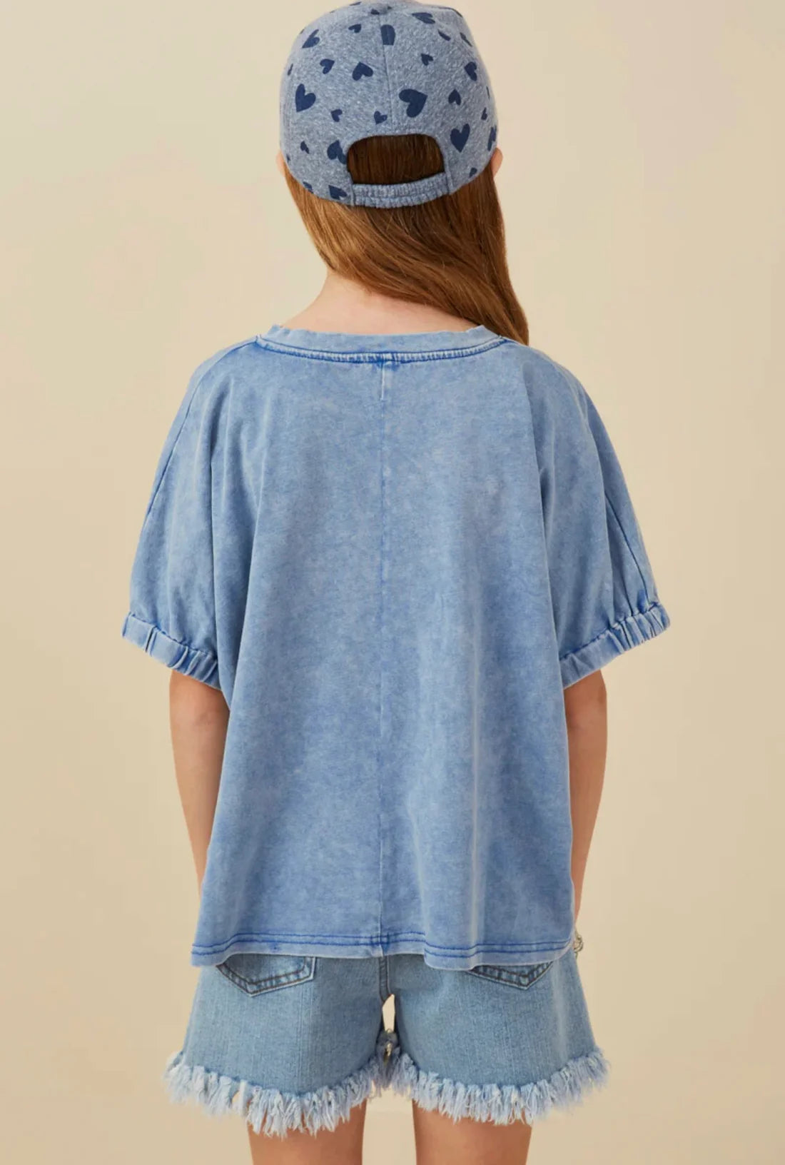 Ready to say "bye bye" to basic tees? Our Tween Washed Tee is where it's at! With a funky wash to keep things cool, a v neck and elastic sleeve for comfort, and a front pocket for that extra touch of style, this tee is a must-have. Oh, and did we mention it comes in blue? Get it now!