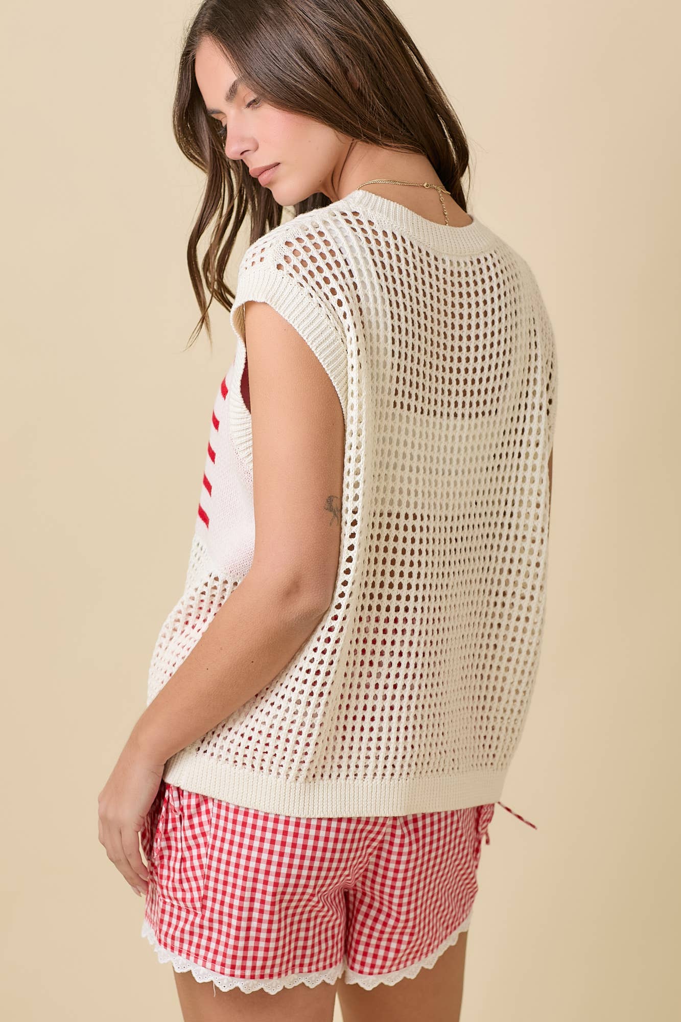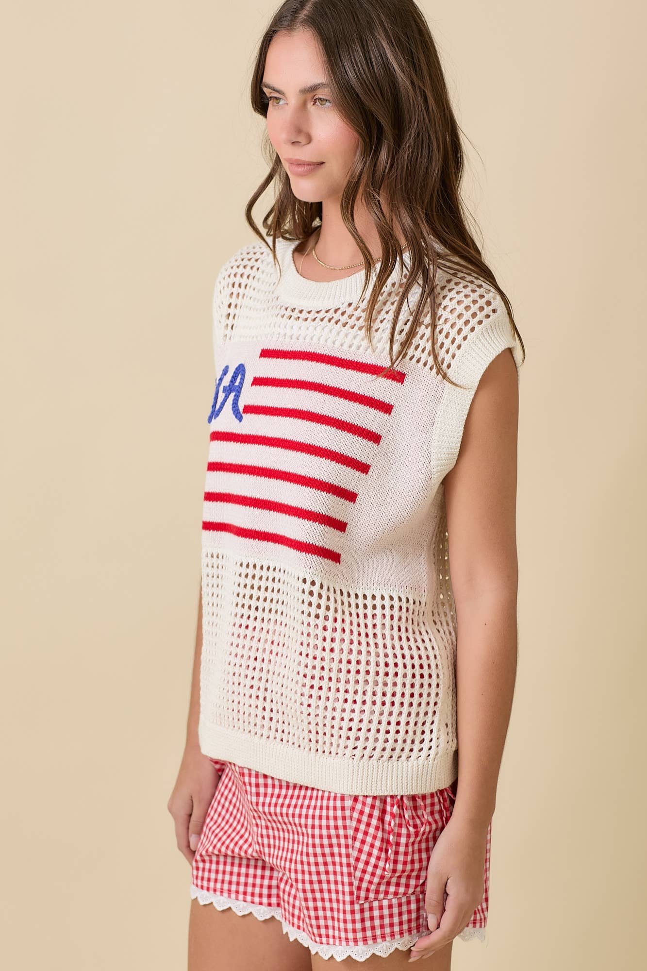 Celebrate red, white, and cute with our Star-Spangled Top! This sleeveless crochet top features open-knit panels for a breezy summer feel, a bold red stripe flag-inspired design across the chest, and a playful textured “USA” stitched in bright blue. The soft ivory knit keeps things comfy while serving major patriotic style. Perfect for backyard BBQs, firework-filled nights, or your Fourth of July fit—just add denim shorts or a gingham skirt and you're ready to party in the USA!