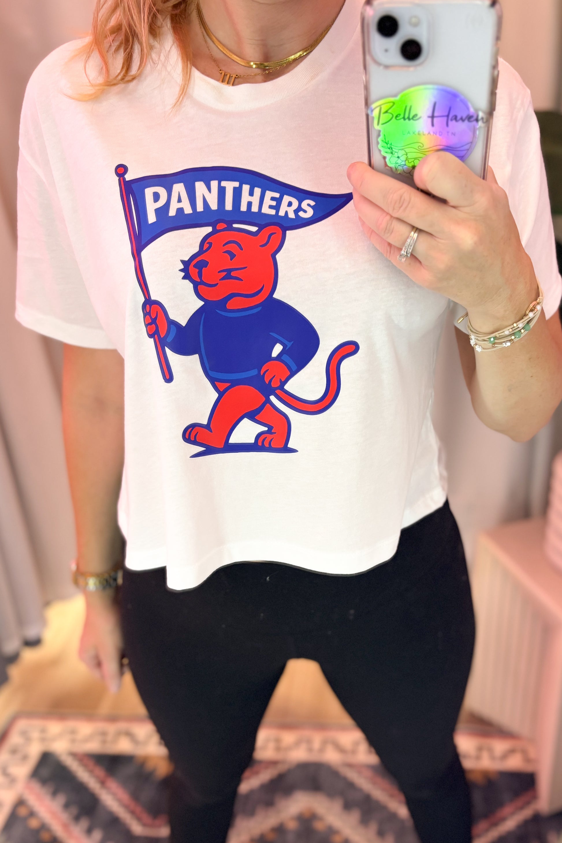 Show up and show out for game day in our Proud Panther Crop Tee! This crisp white cropped tee features a bold red-and-blue vintage-style panther mascot carrying the team pennant—perfect for repping your school spirit in a fresh, fun way. Made from a soft, lightweight cotton blend, it’s comfortable enough for tailgates, bleacher seats, or just running errands around town on game week.