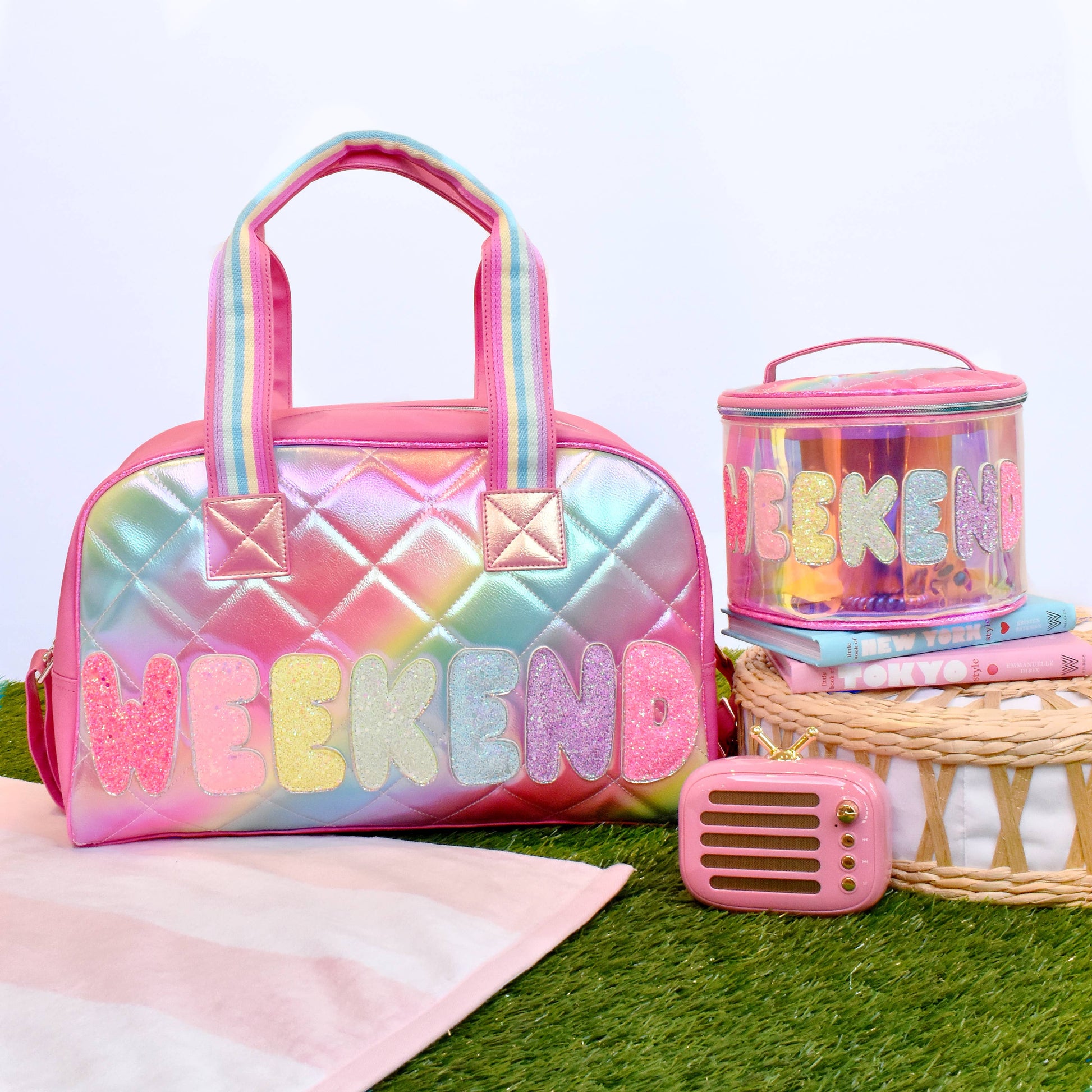 Help make their weekend adventures a whirlwind of good vibes and good times with this duffle bag that puts the 'fun' in both 'funky' and 'functional!' Painted in a metallic ombre print and finished with rainbow glitter bubble-letter patches, this bag is both sturdy and sparkly enough to give them a weekend they'll never forget!