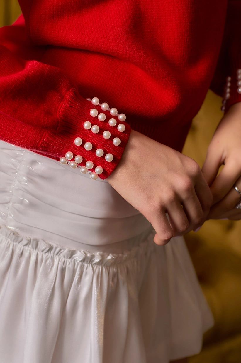 This festive red sweater is a holiday must-have! Embellished with elegant pearl detailing along the neckline and cuffs, it adds a touch of glamour to any seasonal outfit. Made from a soft, cozy fabric, it features a classic, slightly fitted silhouette with gentle puff sleeves for a feminine flair. Perfect for holiday gatherings, this sweater pairs beautifully with skirts or trousers, giving you a chic, polished look for any celebration. Embrace the holiday spirit with style and sophistication in this pearl-accented piece!